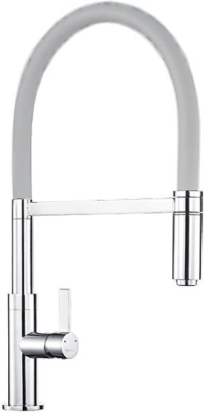 Spirale single lever rinser kitchen tap in chrome with light grey hose.