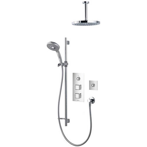 Aqualisa Infinia Digital smart shower pack 41 for gravity pumped systems (thermostatic). Complete with slide rail kit, valve, remote control, 250mm round shower head, ceiling mounting arm and chrome/white Piazza handles.
