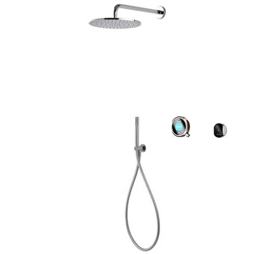 Aqualisa Q Edition digital smart shower pack 03RG for combination boilers and high pressure system (thermostatic). Complete kit with dual shower outlet mixer unit, controller, wireless remote control, slim handset, holder, wall outlet, round drencher shower head and metallic rose gold accent pack.