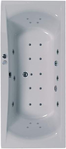 Eclipse double ended whirlpool bath with 24 jets, pre-fitted pump, legs, pop up waste and underwater LED light. Size 1800 x 800mm.