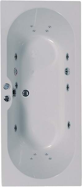 Double ended whirlpool bath with 14 jets, legs and pre-fitted pump. Size 1800 x 800mm.
