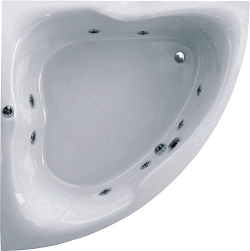 Corner whirlpool bath with 8 jets, legs and pre-fitted pump. Size 1500 x 1500mm.