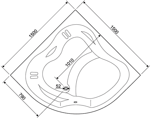 Large corner turbo whirlpool bath with 14 jets, legs, pre-fitted pump. Size 1500 x 1500mm.