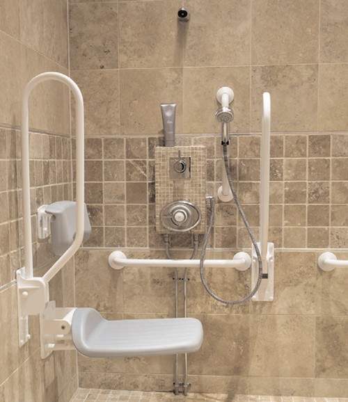 Shower pack with thermostatic shower and white grab rails.