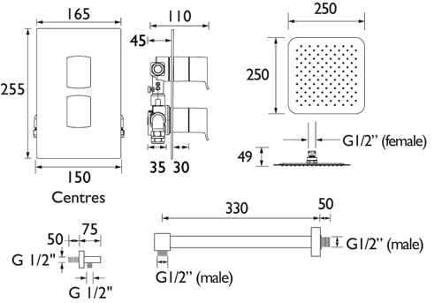 - Square slimline fixed head and wall mounting arm (250x250mm).