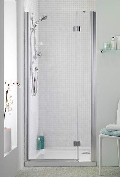 900mm Hinged shower door in polished silver finish.