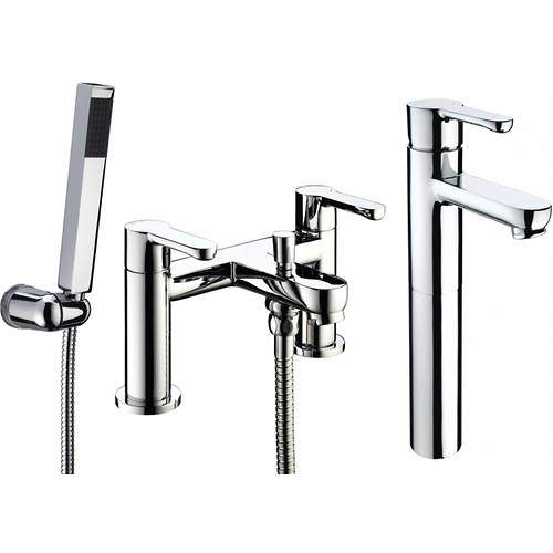 Bristan Nero tall basin and bath shower mixer tap pack in chrome finish.