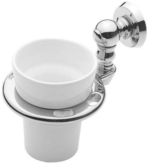 Toothbrush and tumbler holder in chrome with a ceramic tumbler.