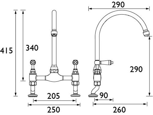 Bristan Renaissance deck mounted kitchen mixer tap in brushed nickel with cranked legs.