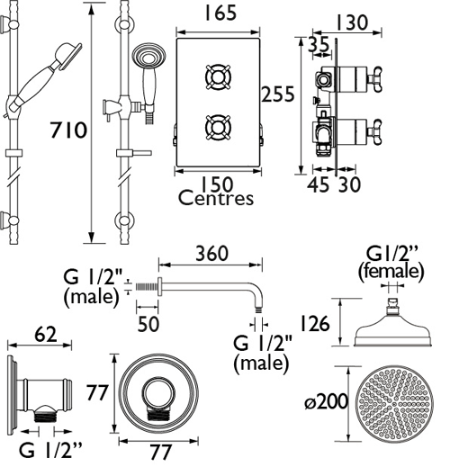 - Round traditional fixed head and wall mounting arm (200mm diameter).