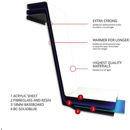 - Reinforced with layers of fibreglass, resin and a special hardening composite called BC-SoIidblue which makes the baths much stronger and improves insulation.