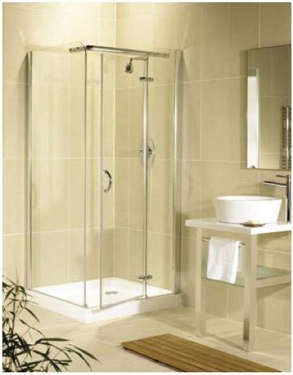 Allure 900x900mm right hand shower enclosure with hinged door and side panel.