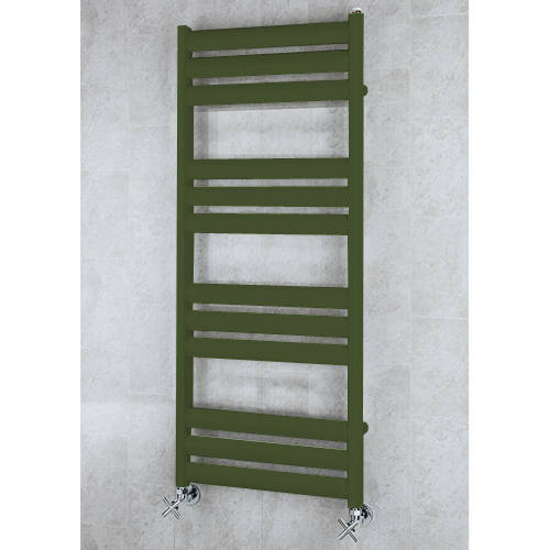 COLOUR Tallis heated ladder rail with oval steel tube and wall brackets in grey olive (1060x500mm).