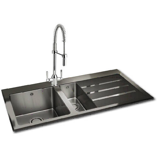 Carron Phoenix Silhouette 150 double bowl, stainless steel and black glass inset kitchen sink with waste and right handed drainer (RHD).