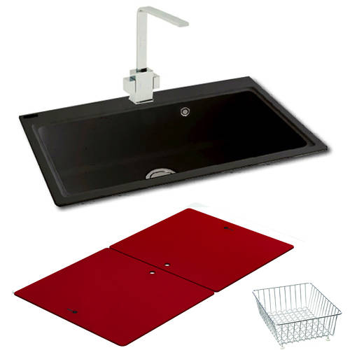 Carron Phoenix Samoa 50 single bowl, granite inset kitchen sink in jet black with red glass panels, wire basket and waste.