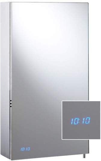 Esk mirror bathroom cabinet in stainless steel with single door and LED clock. Size 300W x 550H x 120D mm.