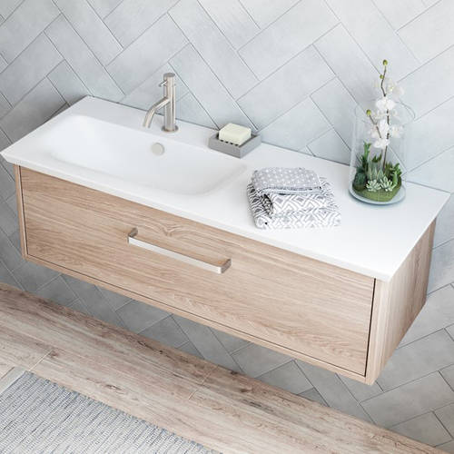 Crosswater Arena wall mounted vanity unit in Modern Oak colour with White Ceramic basin (1000mm, left handed basin).