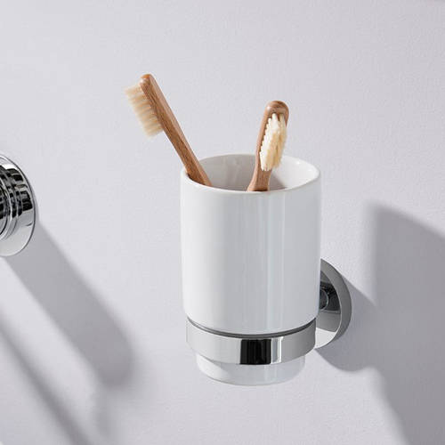 Crosswater Central bathroom accessories pack in chrome with ceramic soap dish, tumbler and toilet roll holder (pack 6).
