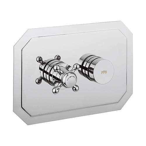 Crosswater Belgravia thermostatic push button shower valve with one outlet, traditional back plate and crosshead handle.