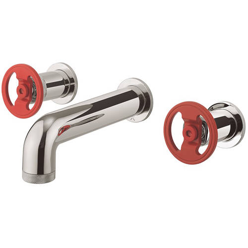 Crosswater UNION 3 hole wall mounted basin mixer tap in chrome with red wheel handles.