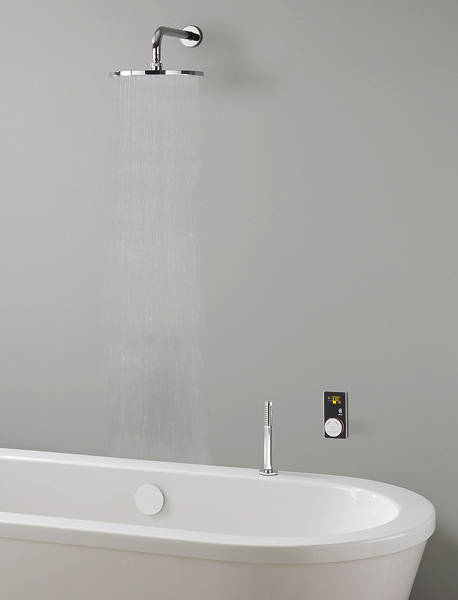Elite Ultimate Pack - digital shower and bath processor in black with LED screen, bottom filling digital bath filler, pull out hand shower, wall mounted round fixed shower head, 3 water outlets, app control, lights, 3 temperature settings and mixer unit.
