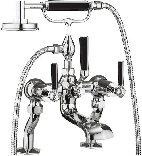 Waldorf traditional mono basin and bath shower mixer tap pack in chrome with pop up basin waste and black lever handles.