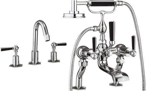 Waldorf traditional 3 hole basin and bath shower mixer tap pack in chrome with black lever handles.