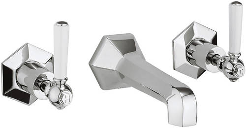 Waldorf traditional wall mounted 3 hole basin mixer tap in chrome with white lever handles.