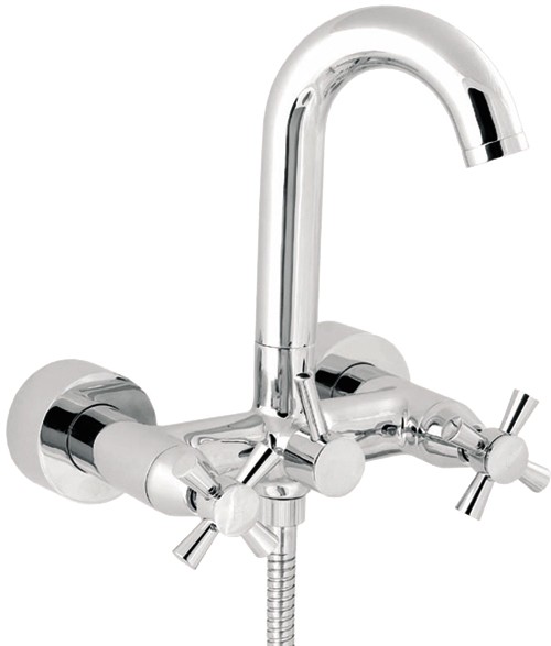 Wall mounted bath shower mixer tap with shower kit and wall bracket for shower handset.