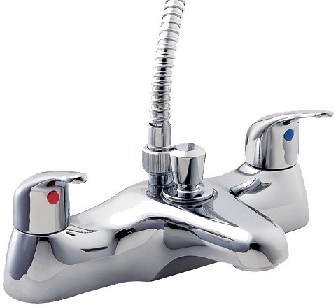 Bath shower mixer tap in chrome with shower kit. This product can be fitted with a Deva flow restrictor to reduce water wastage and protect the environment.