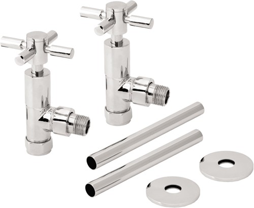 Pair of angled radiator valves with cross head handles, pipes and trim in chrome.