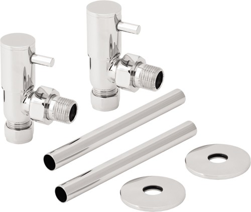 Pair of angled radiator valves with lever handles, pipes and trim in chrome.