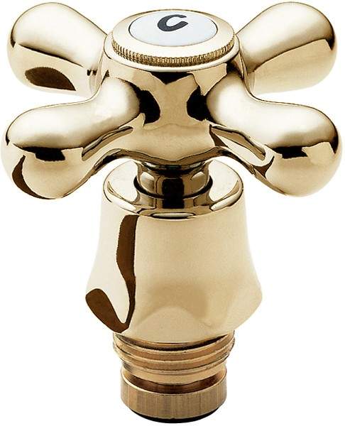 Period style conversion tap head kit with pair of gold handles. Suitable to replace most basin, bath and sink tap heads that conform to BS5412.