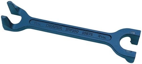 BSP Basin wrench 1/2" x 3/4" (15x22mm). Malleable cast iron wrench with accurately machined jaw faces. Designed for horizontal or vertical use in confined areas on back nuts fitted to taps and basins and other fittings.