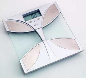 Imperius silver and glass digital bathroom scales with body fat indicator.