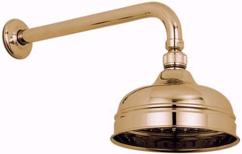 Traditional 6" fixed shower head and arm in gold. Minimum water pressure 0.3 bar.