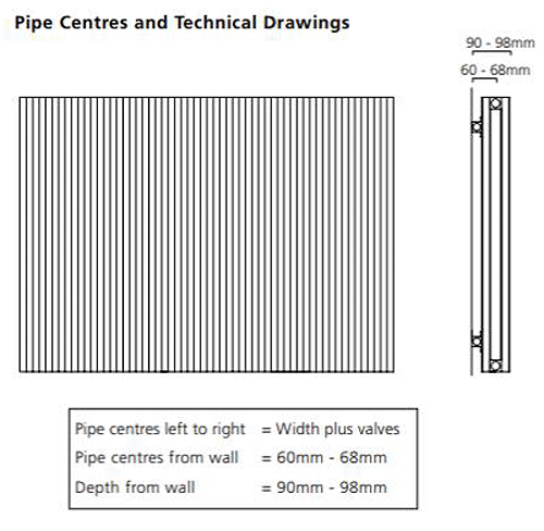 - Pipe centres left to right: width of radiator plus valves.
