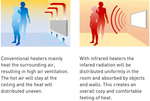 EUCOTHERM Infrared Radiators use the principle of solar radiation and provide comforting warmth to every room. This radiation does not need air to transport the heat but permeates it nearly lossless and turns into heat wherever it meets objects, walls and ceilings. These store the heat and release it evenly into the room. Thus the rooms are always warm and dry. EUCOTHERM infrared-heaters are up to 50 % cheaper than conventional heating systems.