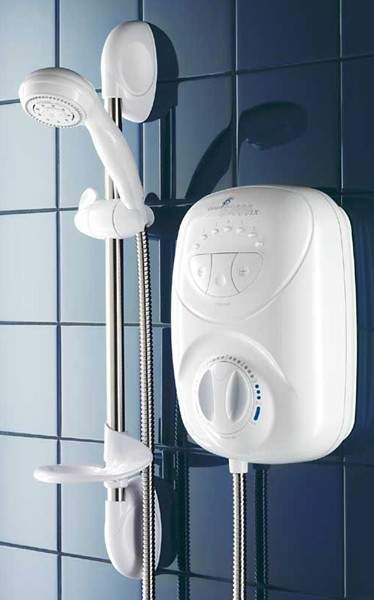 Galaxy G2000 LX thermostatic power shower in white and chrome. A thermostatic shower can be set to a temperature and will maintain that temperature even when the incoming water temperature or pressure changes.