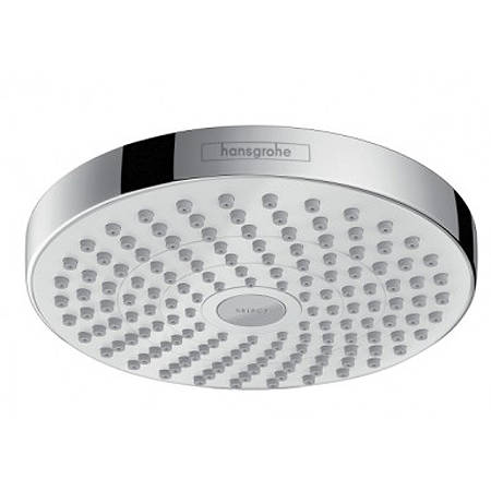 Hansgrohe Croma Select S 180 round EcoSmart shower head in white and chrome with 2 jets.