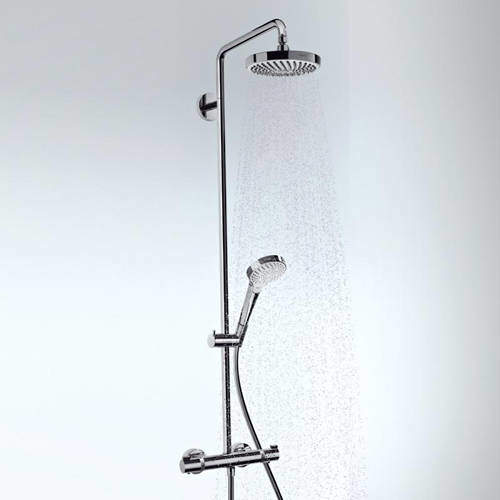 Hansgrohe Croma Select S 180 2 jet Showerpipe shower pack in chrome. With thermostatic valve, riser rail, head, handset and hose.