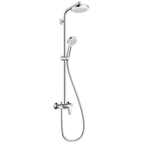 Hansgrohe Crometta 160 1 jet Showerpipe shower pack in white and chrome. With manual valve, riser rail, head, handset and hose.