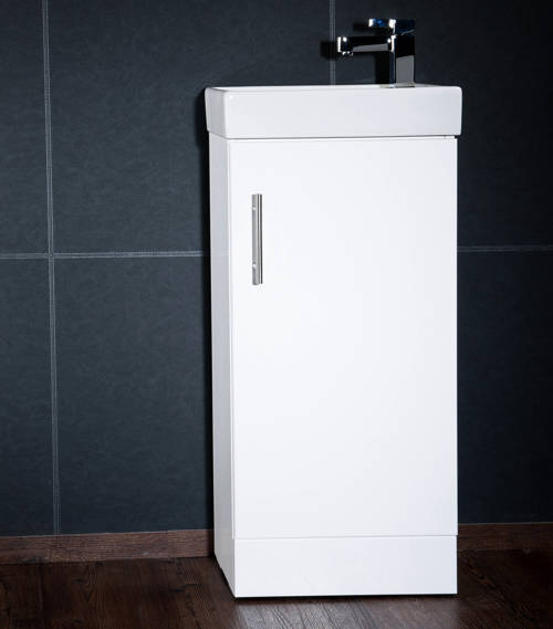 Cube compact bathroom vanity unit in gloss white finish with ceramic basin.