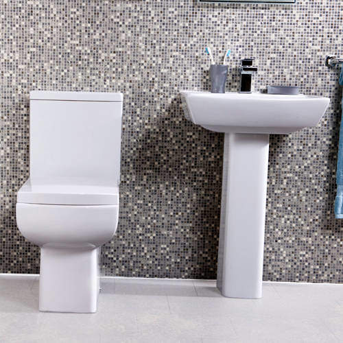 Oxford Daisy Lou contemporary bathroom suite with flush to wall close coupled toilet pan, cistern, seat, one tap hole basin and full pedestal.