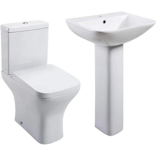 Oxford Fair 4 piece bathroom suite with close coupled toilet pan, cistern, wrapover seat, one tap hole basin and full pedestal.