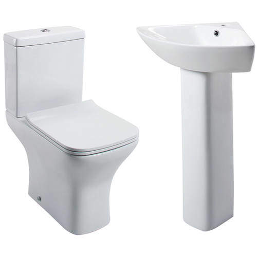 Oxford Fair 4 piece bathroom suite with close coupled toilet pan, cistern, slimline seat, one tap hole corner basin and full pedestal.