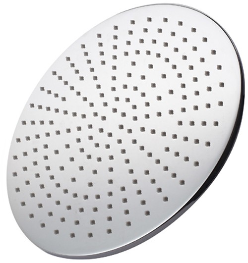 Large round shower head in chrome with swivel knuckle and ceiling mounting arm. Size 300mm.