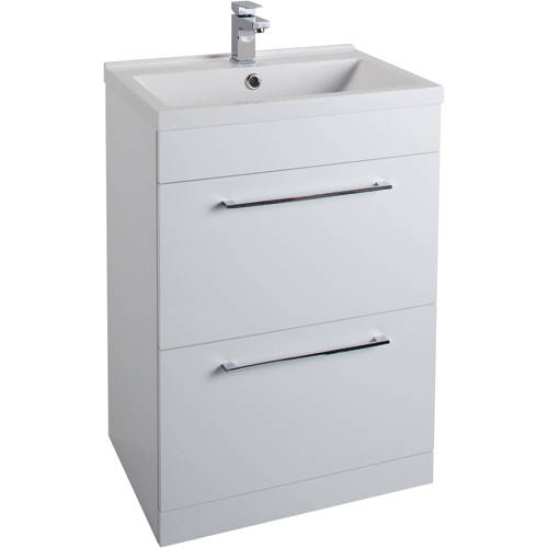 Idon bathroom vanity unit in gloss white finish with drawers and white basin.