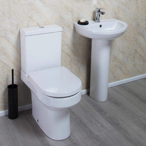 Oxford Montego contemporary bathroom suite with close coupled toilet pan, cistern, seat, one tap hole basin and full pedestal.