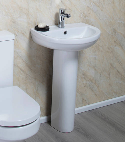Oxford Montego contemporary bathroom suite with D shaped back to wall toilet pan, soft close seat, one tap hole basin and full pedestal.